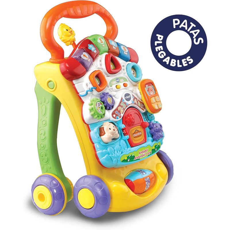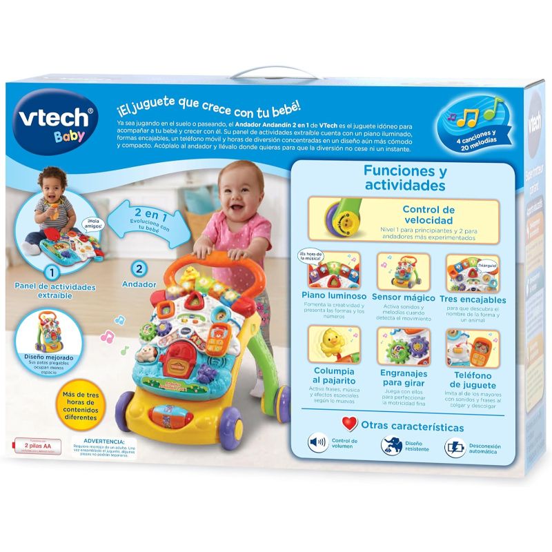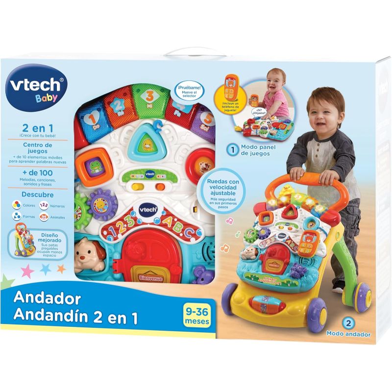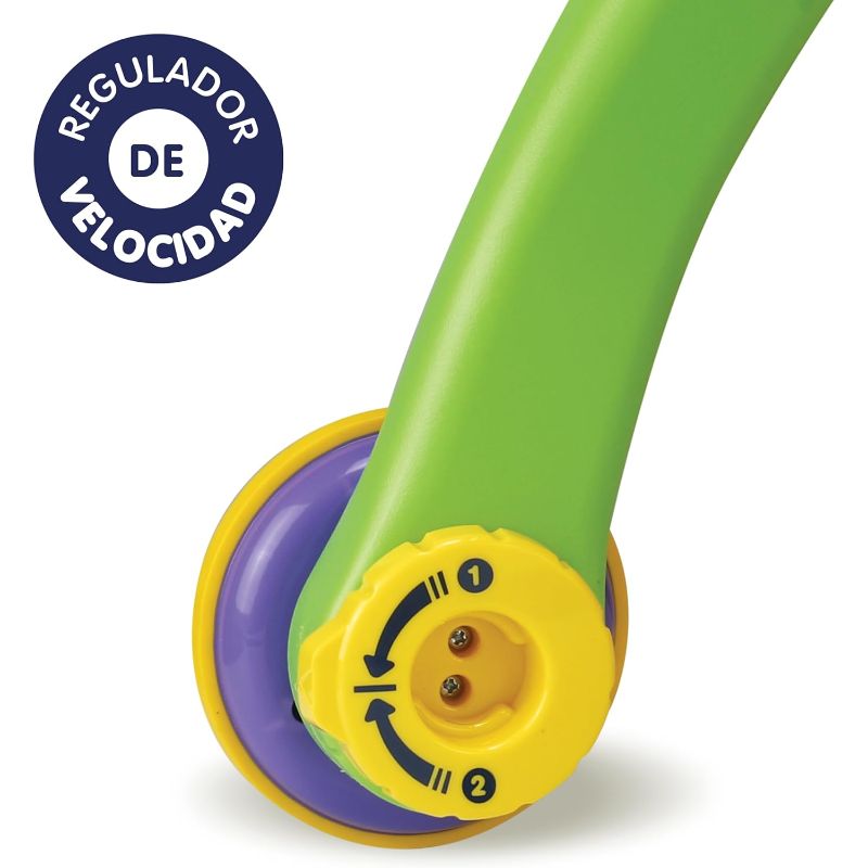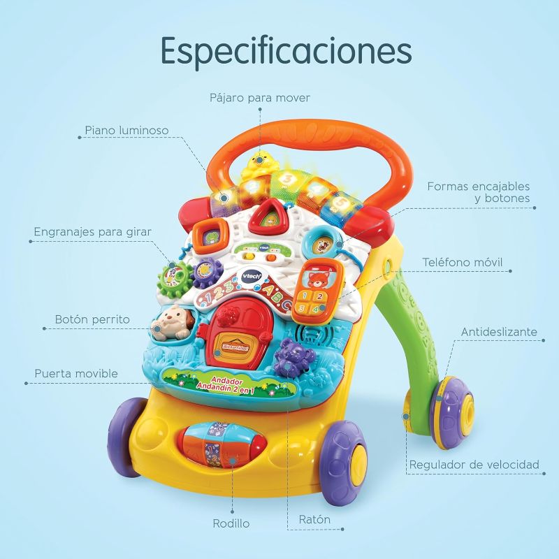 Les rodes tenen control de velocitat (freno regulador) per adaptar-les al nivell del nadó, hi ha multitud de jocs amb llum i so com un piano, encaixos, engranatges i fins i tot un telèfon. A més, les potes del caminador es poden plegar per facilitar l’emmagatzematge.