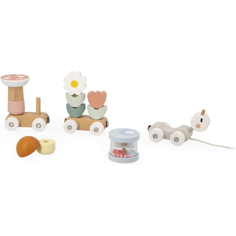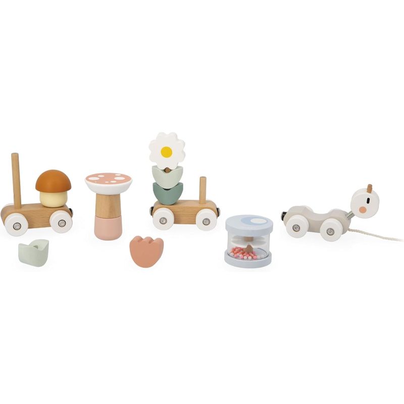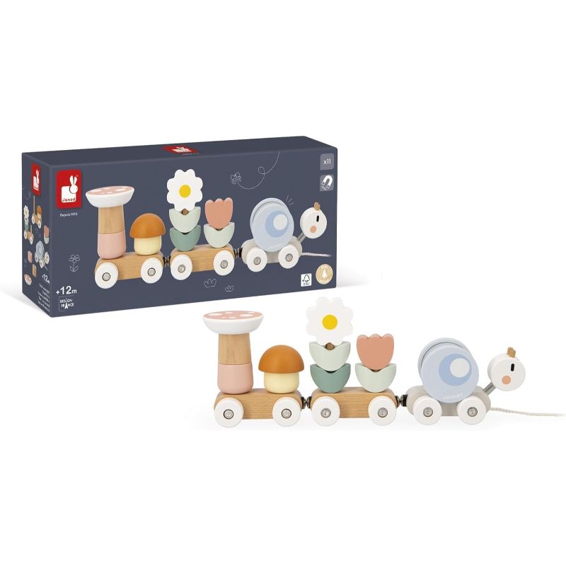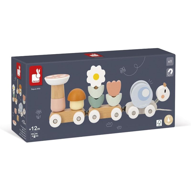 Contiene tres vagones con flores y setas (10 peces), y la cáscara del caracol es extraíble: cuando el tren avanza, gira de forma divertida, y se transforma en un sonajero de bolitas.