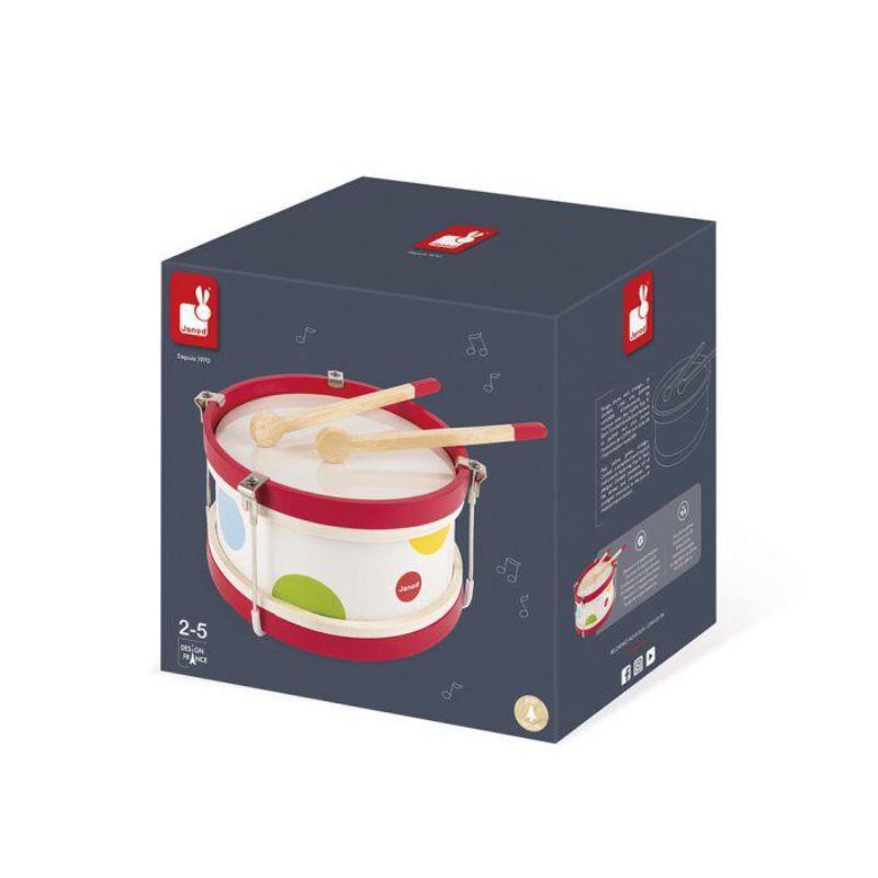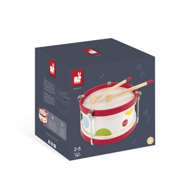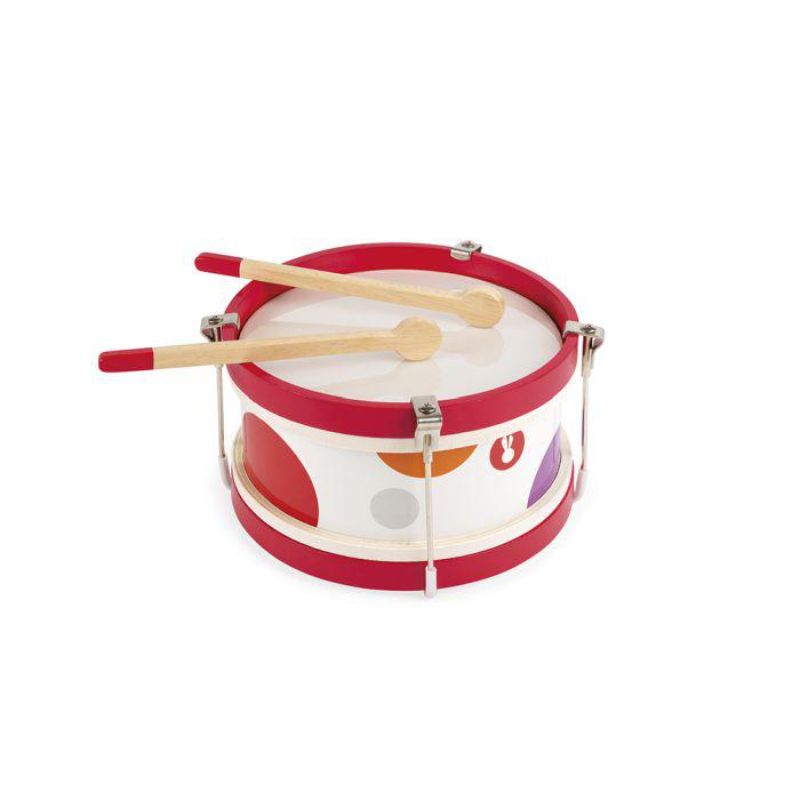 Desperta el ritme del teu infant amb aquest tambor de fusta i pintat de blanc amb cercles de colors.