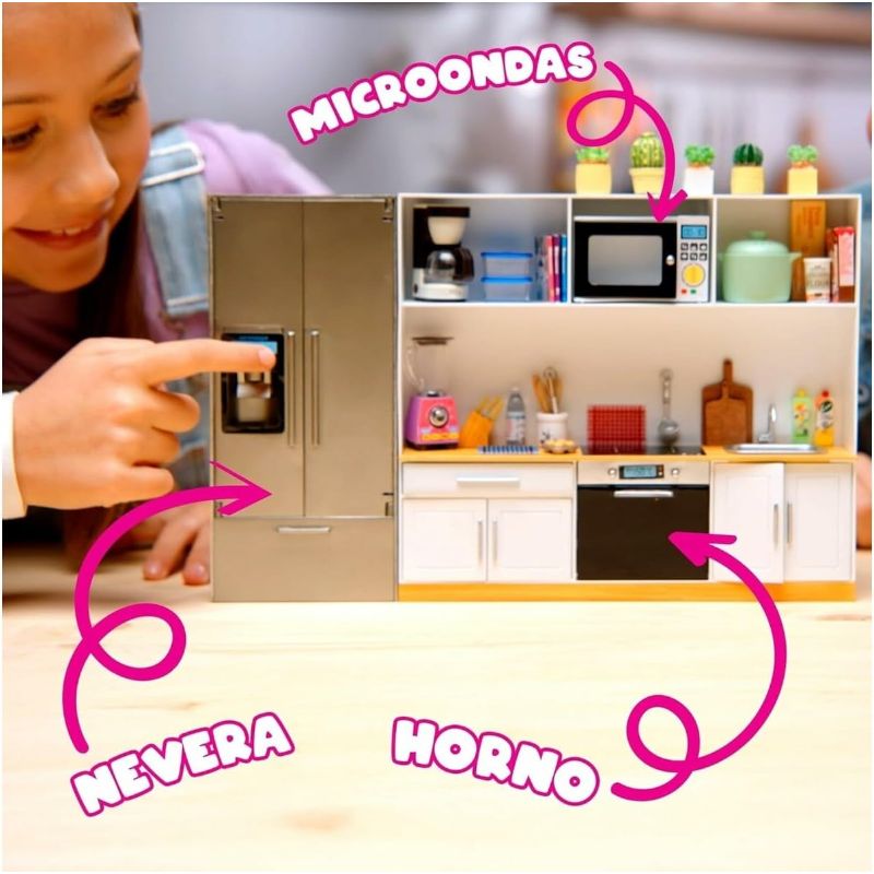 Explora el món de la cuina en miniatura amb el Mini World. Aquest encantador conjunt inclou una cuina mini amb forn, microones, frigorífic, congelador i un dispensador de glaçons, perfectes per recrear tota mena d’escenes imaginatives. A més, incorpora 5 boles sorpreses que contenen accessoris com manoples, un llibre de cuina, una ampolla d’aigua i una d’oli d’oliva, entre d’altres.