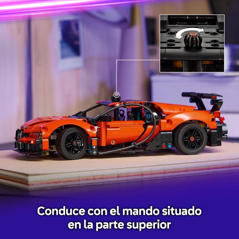 Un detallat set de Lego Technic inspirat en l’icònic Hypercar Bugatti Chiron Pur Sport, pensat per a constructors a partir de 9 anys. Conté 771 peces amb les quals recrear una rèplica realista amb direcció funcional mitjançant un comandament superior, un motor W16 visible, així com portes i capó que s’obren, tot amb una carrosseria taronja de fort contrast i detalls mecànics realistes.