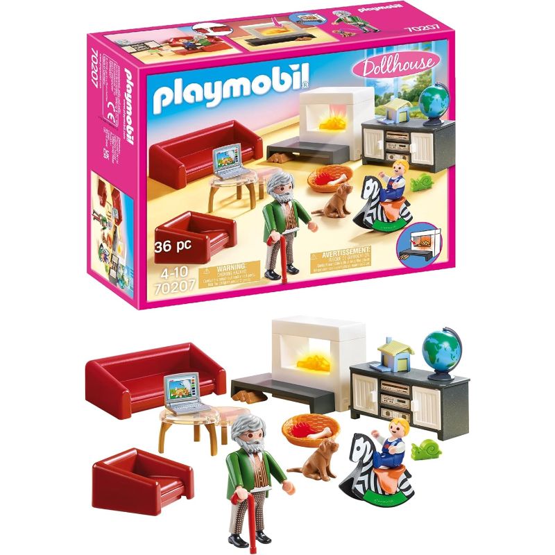 Caixa de la sala d’estar de la sèrie Dollhouse, equipada amb sofà llit, butaca, mobles i una xemeneia amb efecte de foc que crea un ambient acollidor.