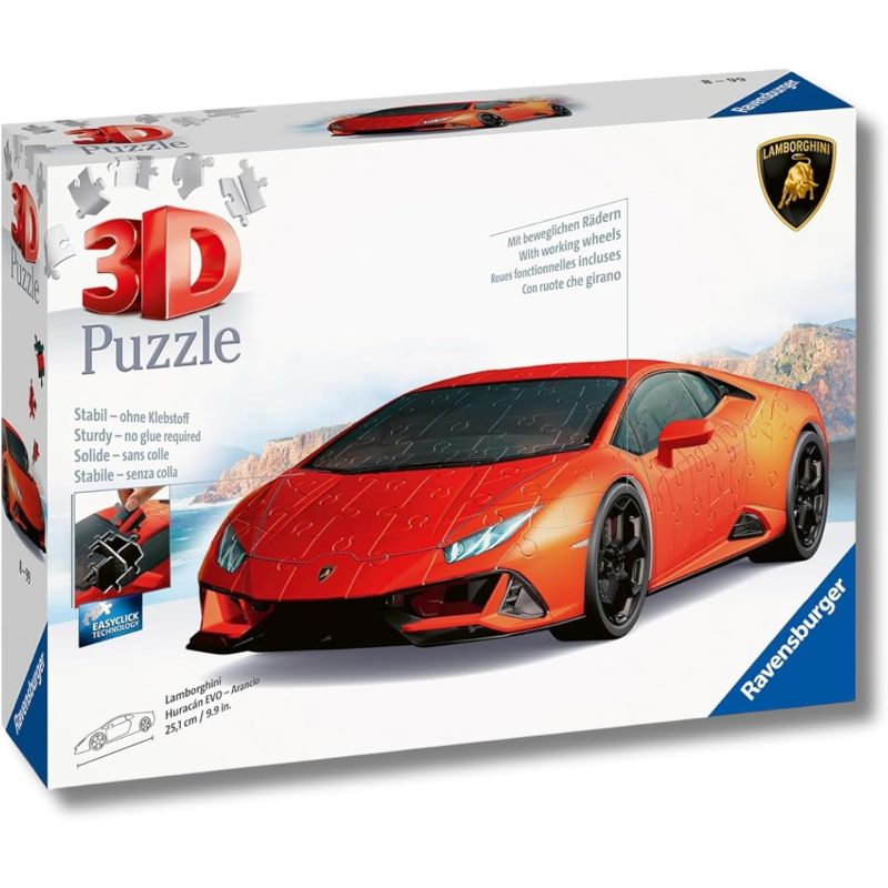 Descobreix el puzle 3D del Lamborghini Huracán EVO Naranja de Ravensburger, una rèplica espectacular del famós esportiu italià. Amb peces de plàstic numerades que encaixen a la perfecció, podràs construir pas a pas aquest icònic vehicle sense necessitat de cola.